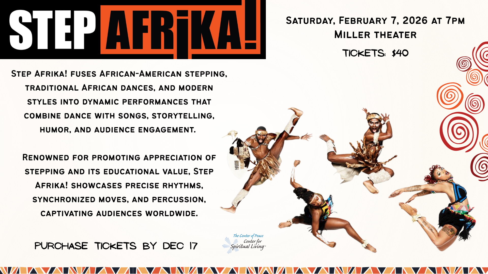 "Beyond the Four Walls" series An opportunity for us to come together in fellowship, spiritual practice, and fun! ------------------------------ Step Afrika! blends percussive dance styles practiced by historically African-American fraternities and sororities; traditional African dances; and an array of contemporary dance and art forms into a cohesive, compelling artistic experience. Performances are much more than…