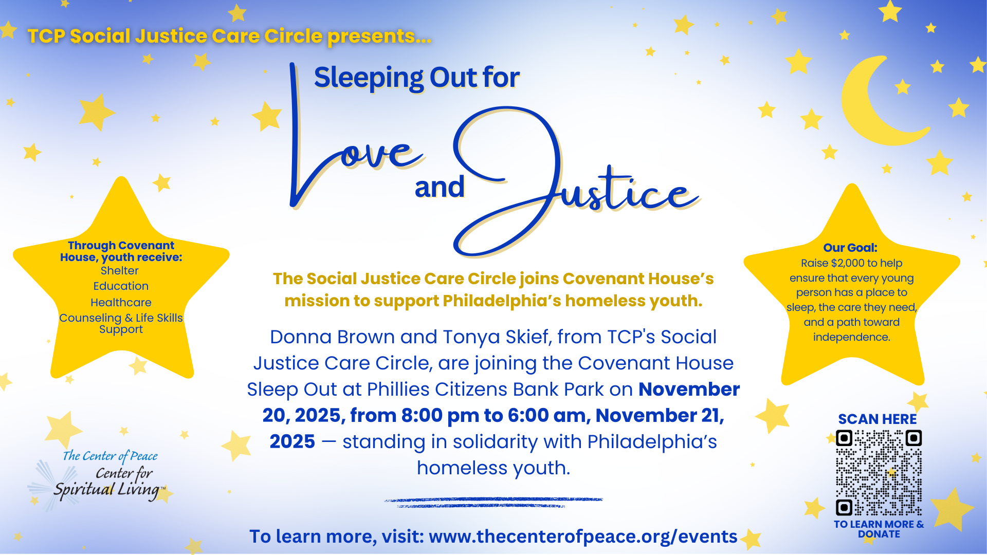 We’re Sleeping Out for Love and Justice! Donna Brown and Tonya Skief, from The Center of Peace's Social Justice Care Circle, are joining the Covenant House Sleep Out at Phillies Citizens Bank Park on November 20, 2025, from 8:00 pm to 6:00 am, November 21, 2025 — standing in solidarity with Philadelphia’s homeless youth. We’re…